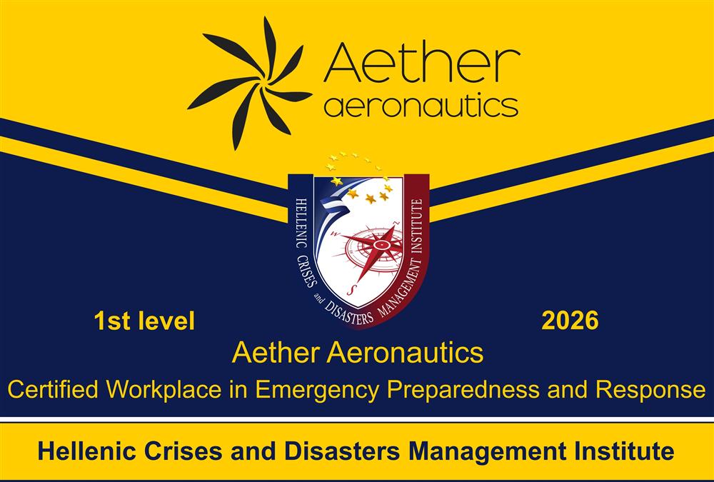 Την πρώτη στην Ελλάδα επίσημη αναγνώριση επαγγελματικού χώρου ως Certified Workplace in Emergency Preparedness and Response – 1st level, απένειμε στην Aether Aeronautics το Ελληνικό Ινστιτούτο Διαχείρισης Κρίσεων και Καταστροφών, Ιδιωτικός και Ανεξάρτητος Οργανισμός ΕΜΠΕΙΡΟΓΝΩΜΟΣΥΝΗΣ στην διαχείριση καταστάσεων εκτάκτου ανάγκης. Πρόκειται για μια διεθνή διάκριση ορόσημο που αντανακλά το επίπεδο υπευθυνότητας της Διοίκησης απέναντι στο στελεχιακό της δυναμικό και την προσήλωσή της στην αδιάλειπτη λειτουργία της.